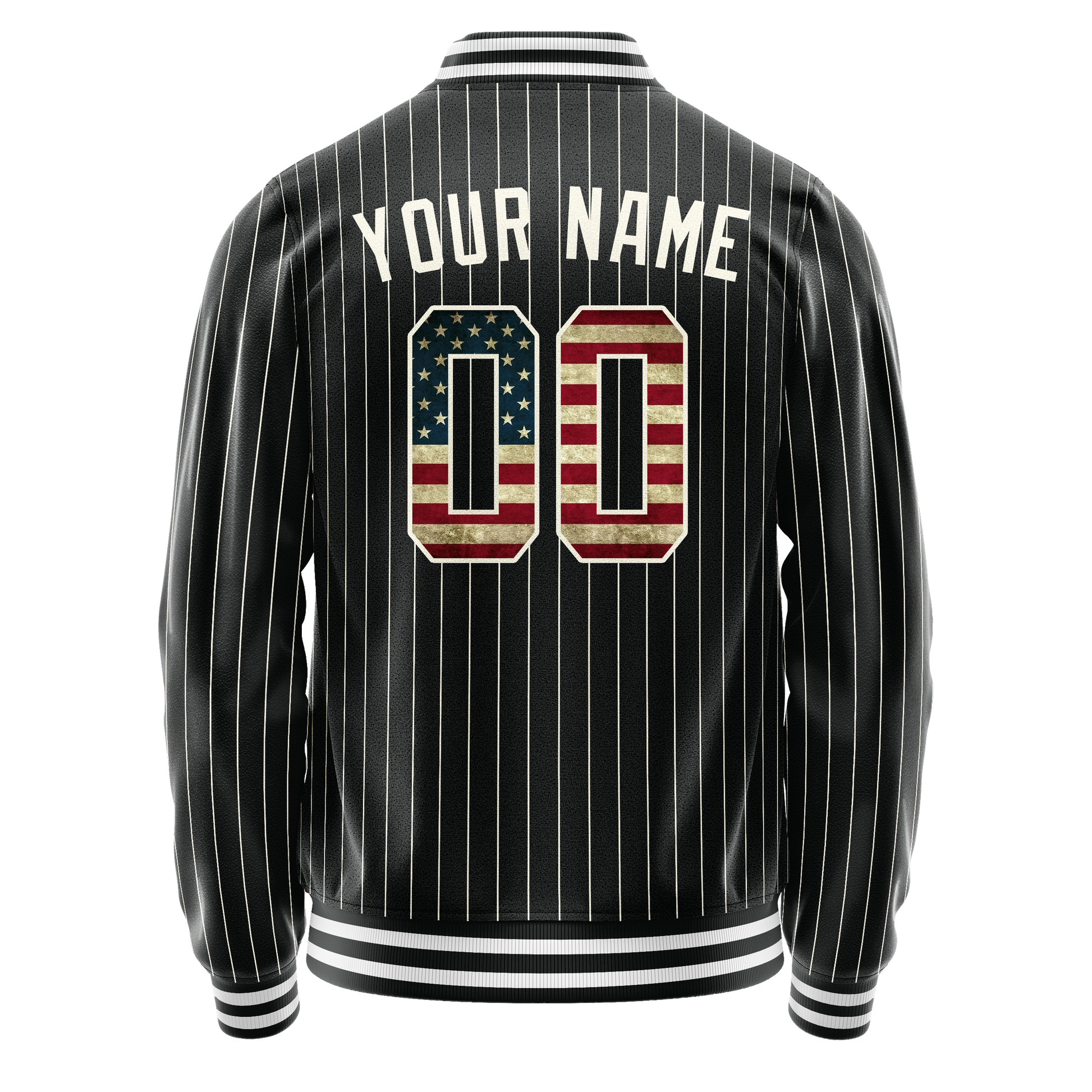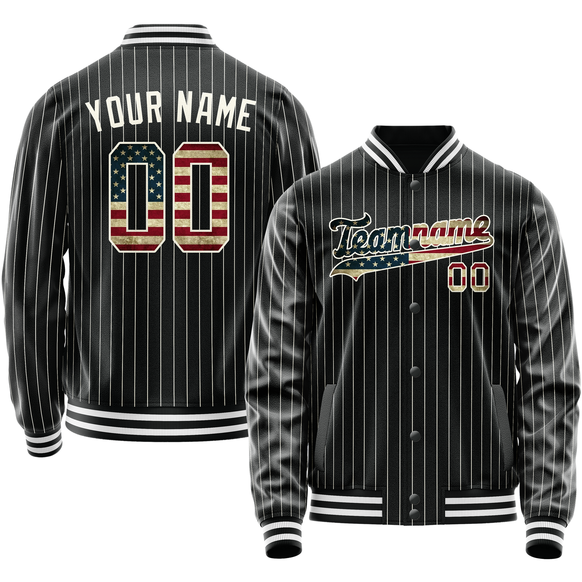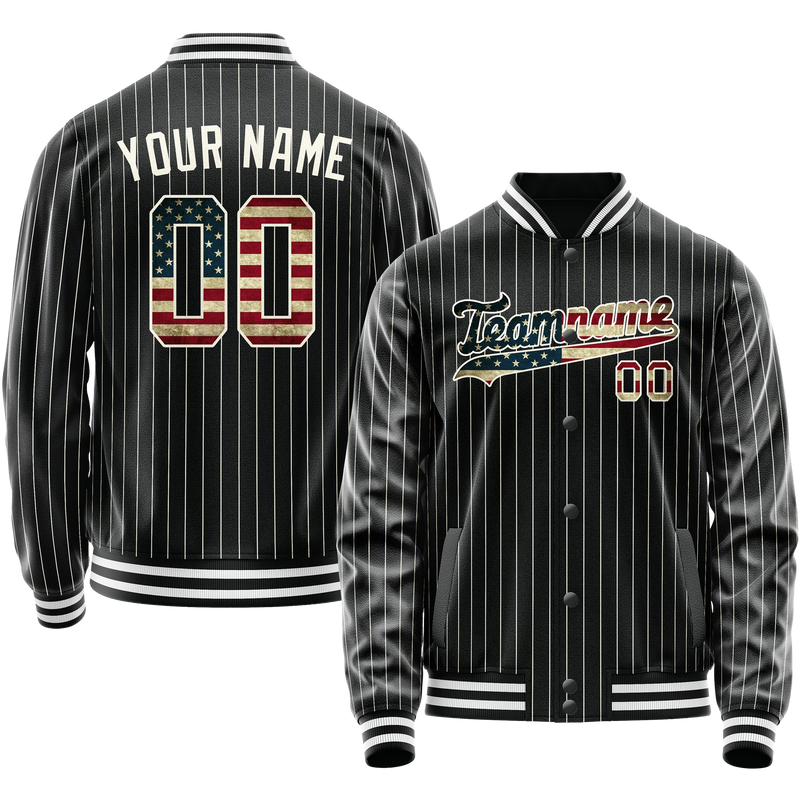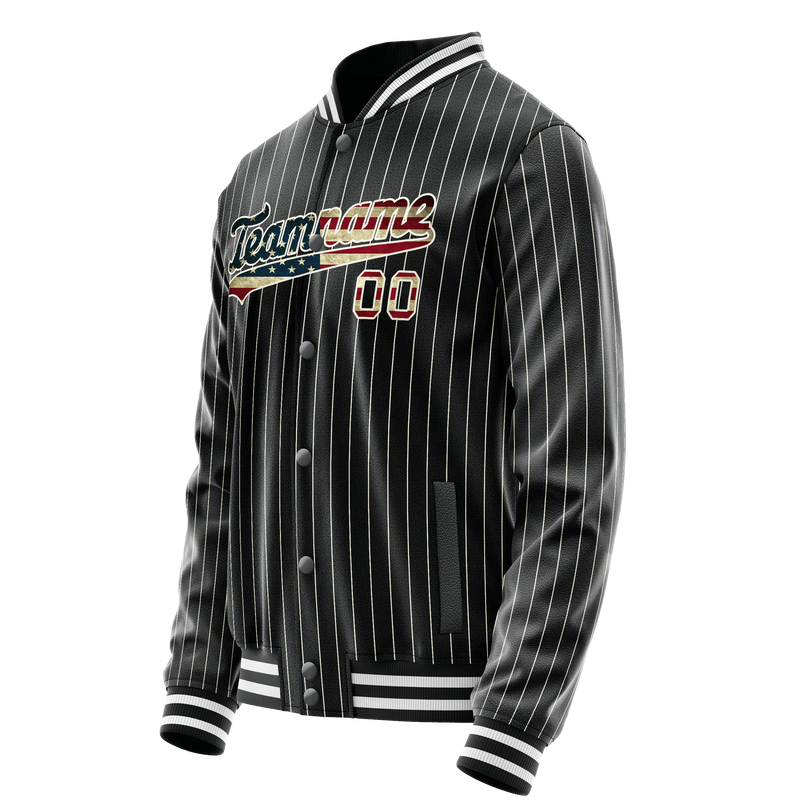 カスタム ブラック ヴィンテージ USA フラッグ クリーム ピンストライプ バーシティ レターマン ジャケット