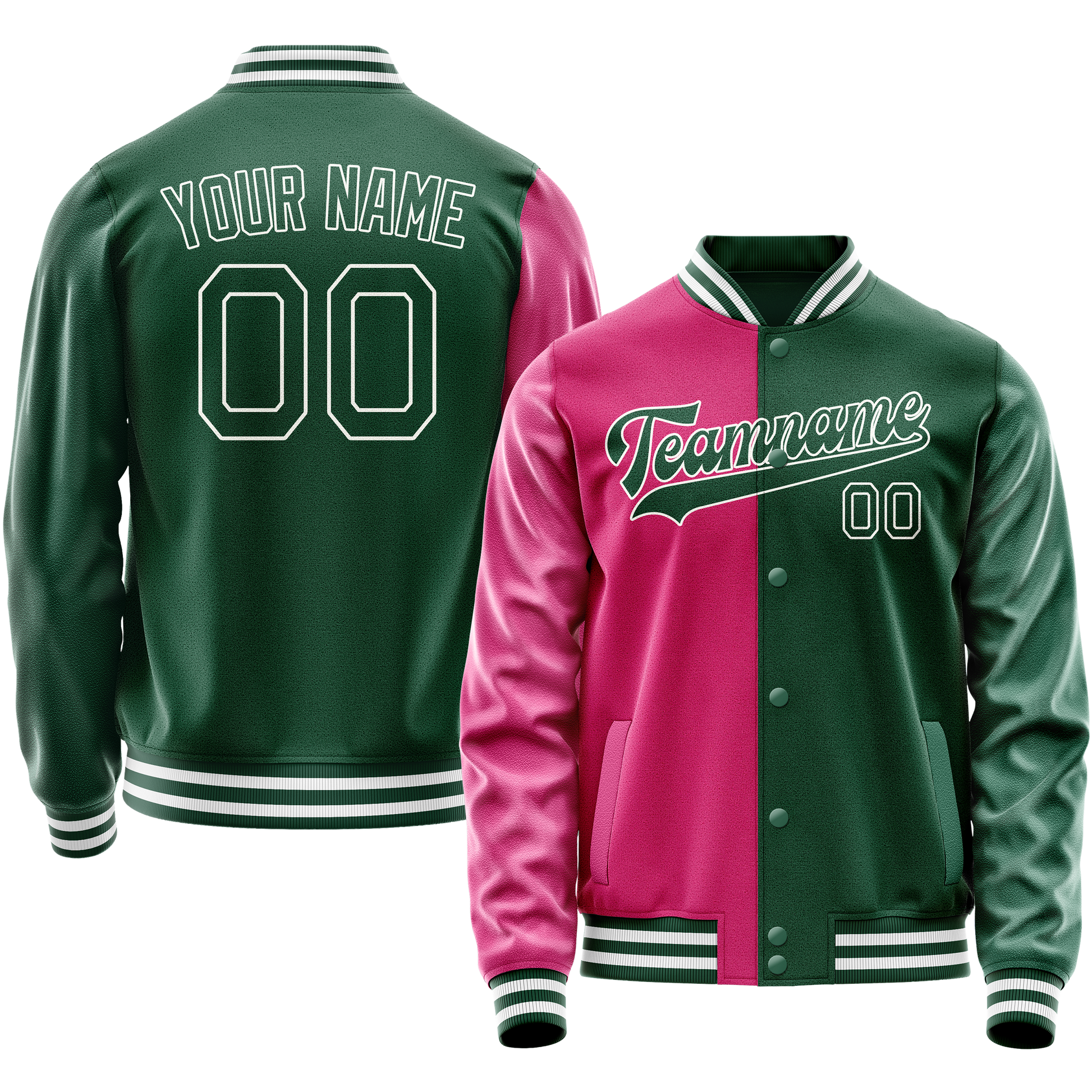 カスタムグリーンピンクスプリットバーシティレターマンジャケット